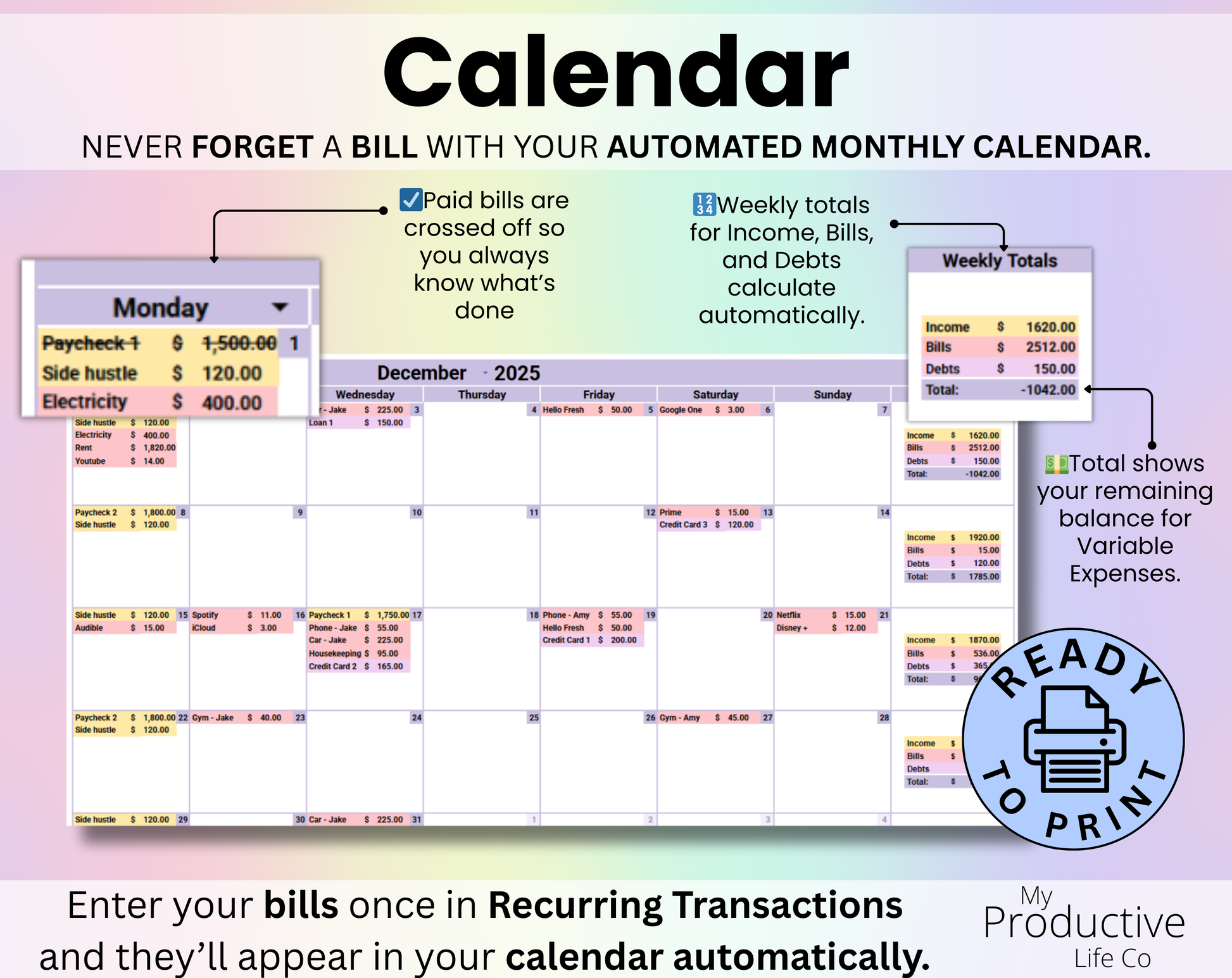 ✓ 12 monthly budget tabs (income, expenses, bills, debts & savings)