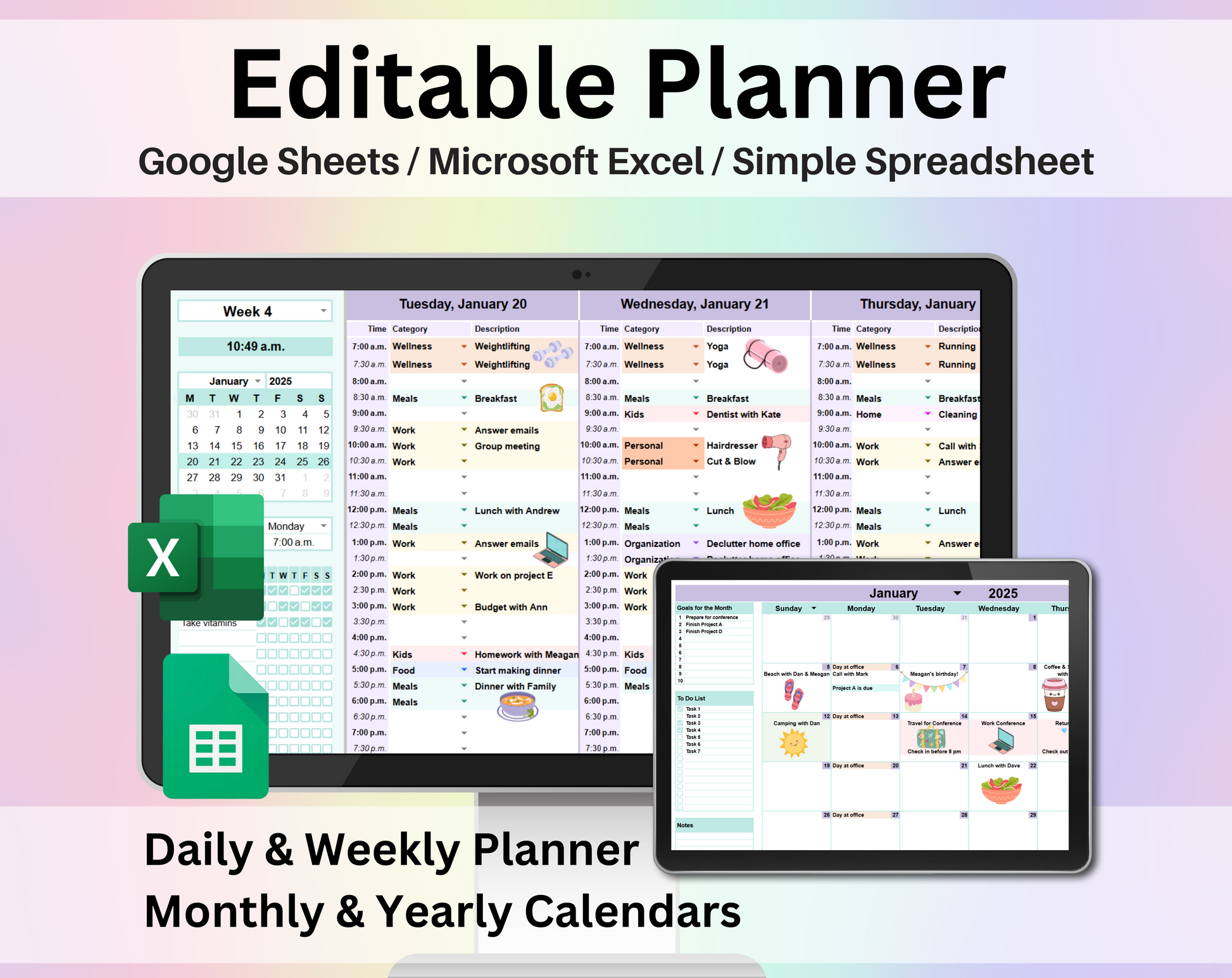 Editable Planner Google Sheets and Excel Digital Planner Template
