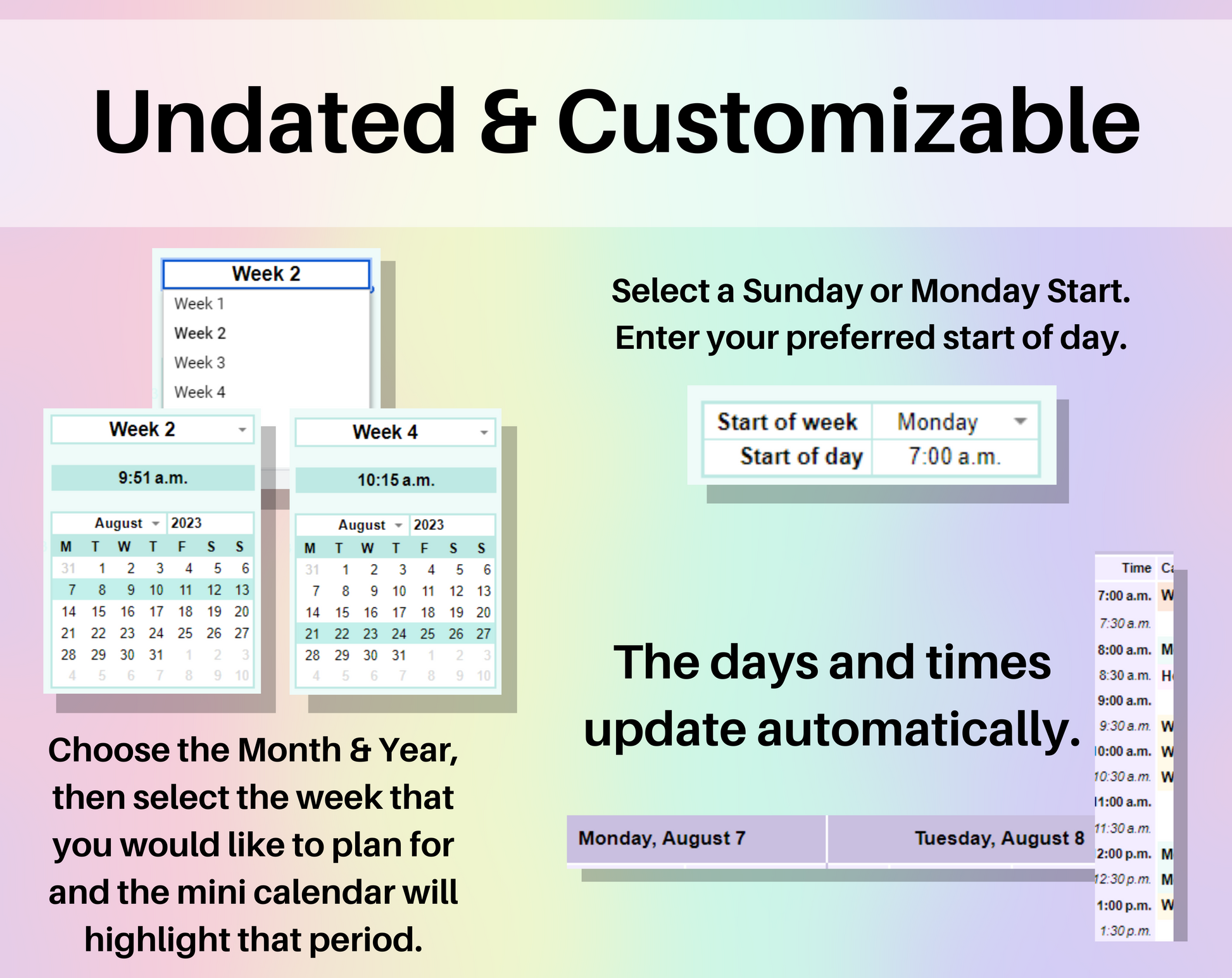Stay organized and productive with this undated and customizable editable planner spreadsheet designed for Google Sheets. Use the daily and weekly schedule to plan our your weeks. Includes a Monthly Calendar and a Yearly Calendar.