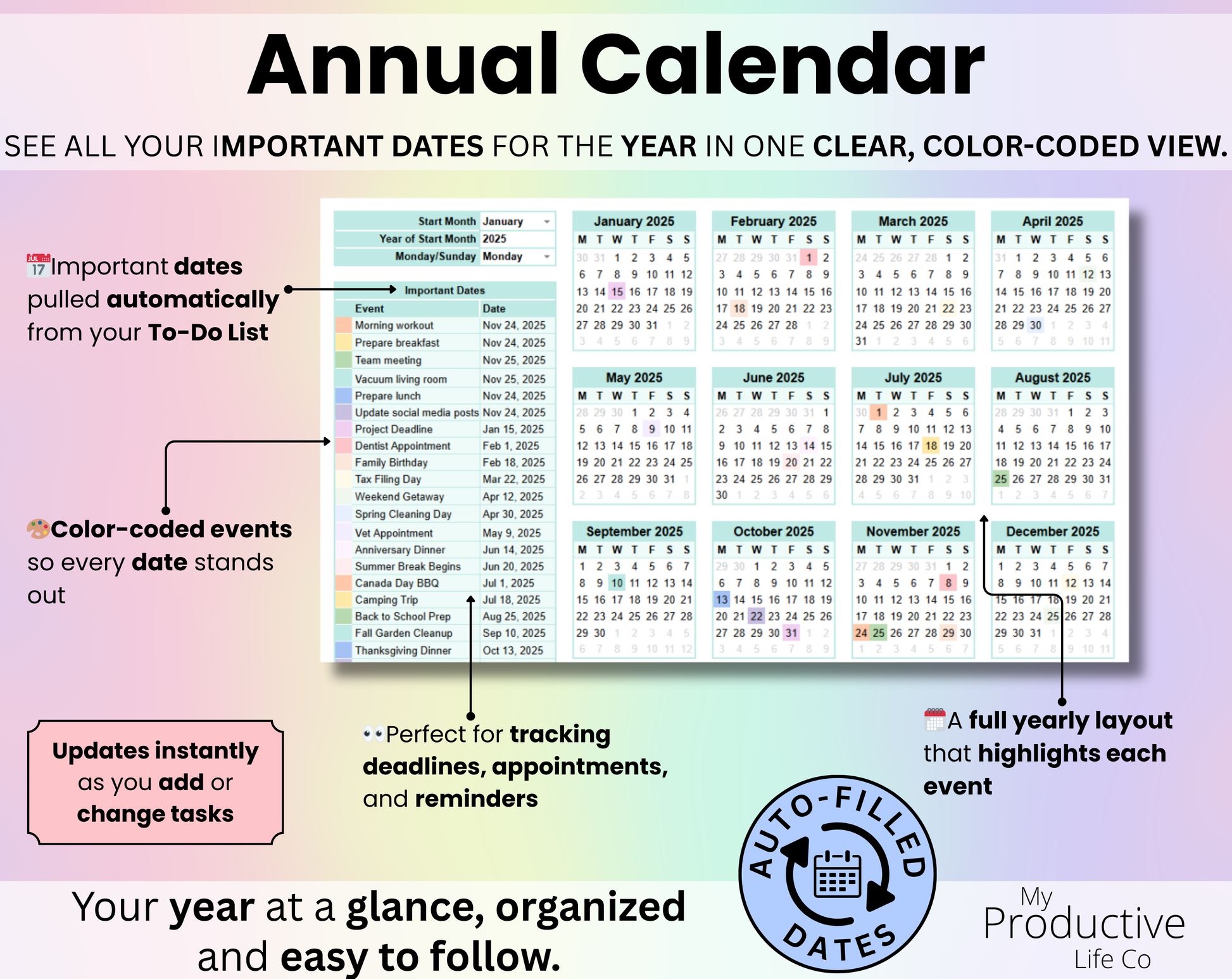 You can enter tasks with categories, priorities, dates, times, status, and notes, and the spreadsheet organizes everything for you automatically. Your daily and weekly schedule fills in based on the times you enter, your monthly calendar sorts tasks by day and time, and your annual overview pulls important dates the moment you add them.