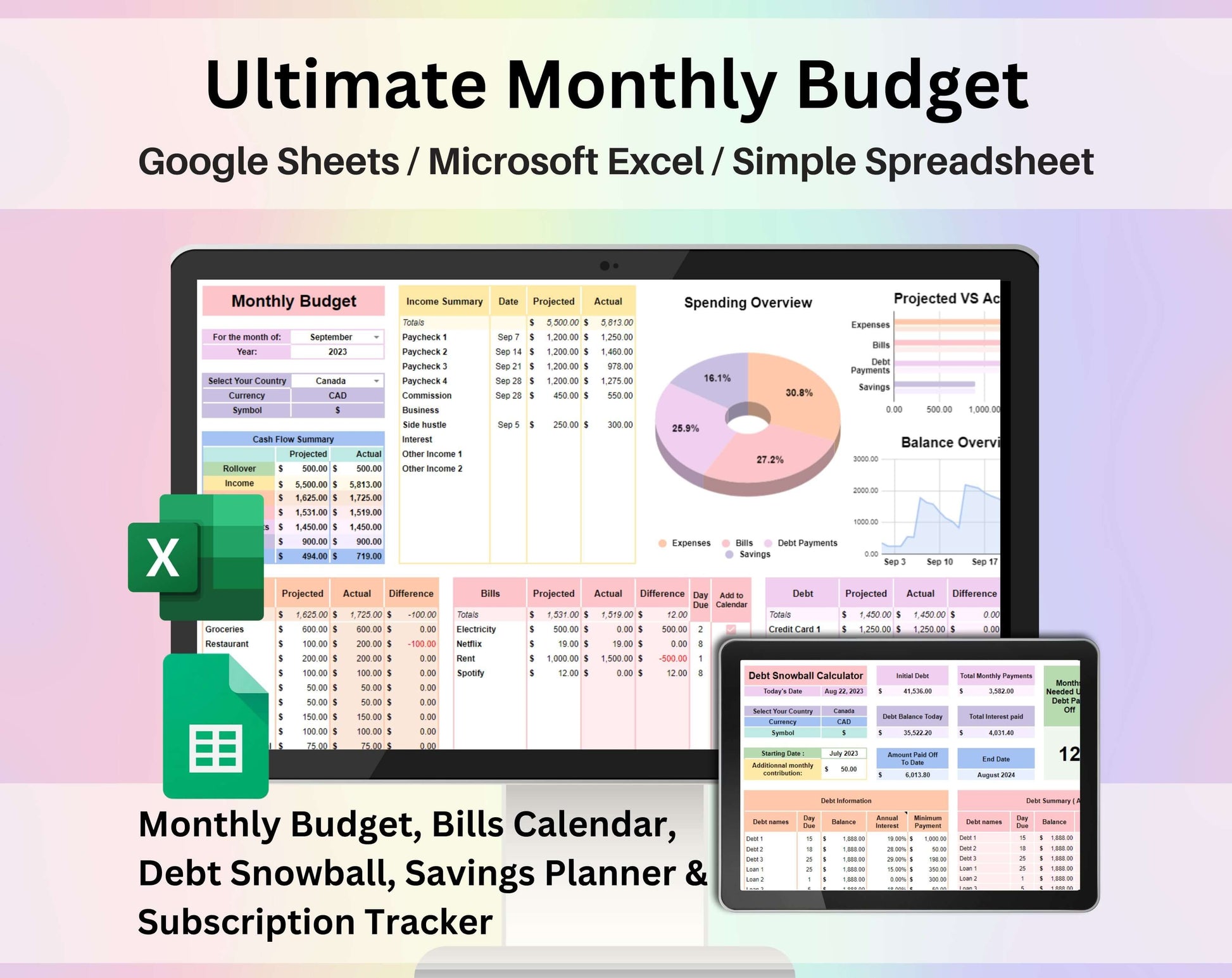 Track monthly spending and net cash flow. Includes an editable bills calendar, a subscription tracker, a debt snowball calculator and a sinking funds. Access your spreadsheet online anywhere via your Google account (free to set up) or Microsoft Excel. Your planner includes most currencies and comes complete with an easy to follow set of instructions.